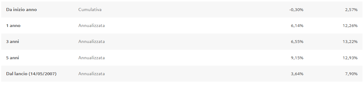 No. O almeno, noi non lo riscontriamo. Vediamo subito che nella tabella sottostante sono indicate le performance annualizzate del fondo rispetto al suo benchmark in diversi archi temporali. Il dato più drammatico deludente è quello del rendimento dal lancio del prodotto.