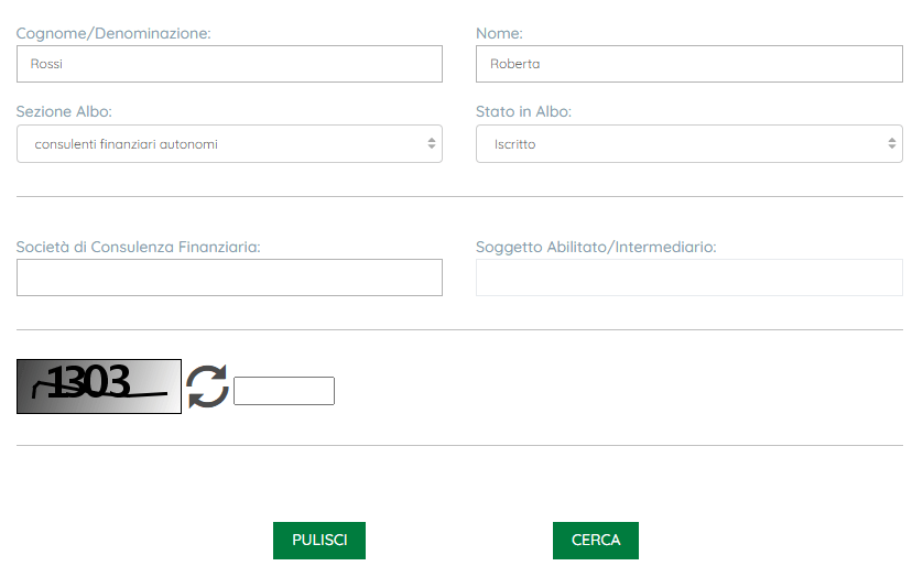 (3) una volta selezionata la pagina corretta, scorri verso il basso e cerca i campi da riempire con il nome e cognome del consulente finanziario indipendente che stai cercando, come mostrato nell’immagine sotto. In questo caso, è stata inserita Rossi Roberta nei campi cognome e nome, è stato selezionato “consulenti finanziari autonomi” nel menù “Sezione Albo” e infine è stato selezionato “iscritto” nel menù “Stato in Albo”. Prima di cliccare su CERCA, ricorda di completare il captcha!