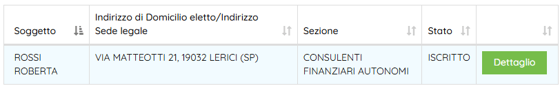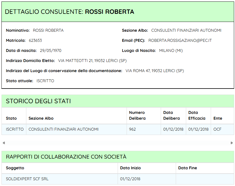 Se inoltre clicchiamo sul bottone “Dettaglio” possiamo accedere a maggiori informazioni riguardanti il consulente finanziario su cui stiamo facendo ricerca. Nel caso di Roberta Rossi, verranno visualizzati i seguenti dettagli: