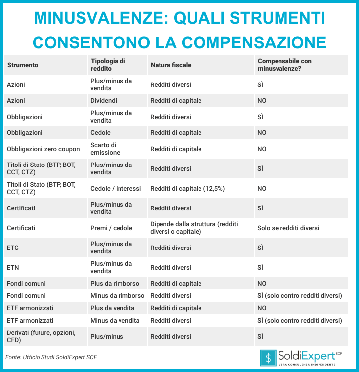 Le minusvalenze generate da ETF e fondi possono essere compensate solo con plusvalenze derivanti da strumenti che producono redditi diversi, ma non con guadagni realizzati su altri ETF o fondi.